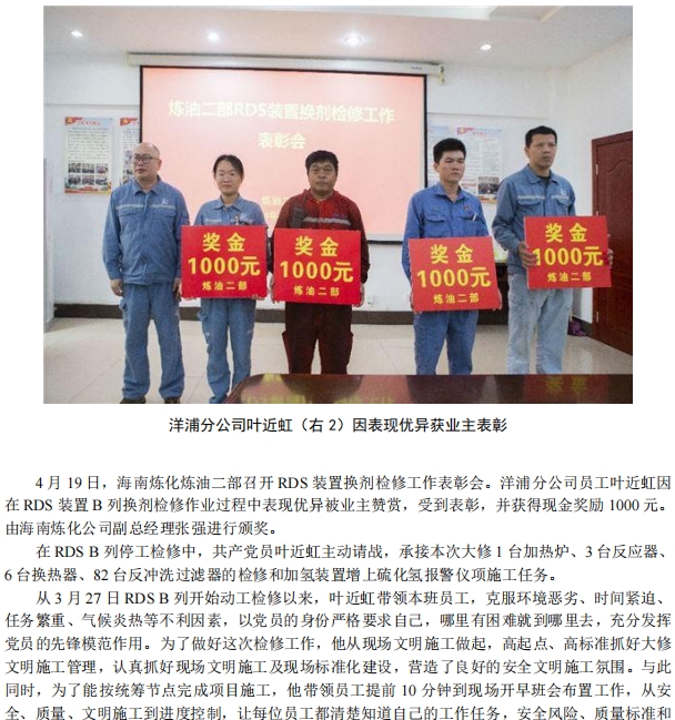 優秀!洋浦分公司(si)葉近虹獲業主表(biao)彰
